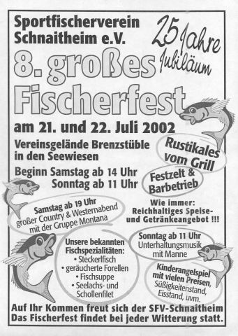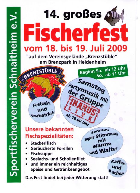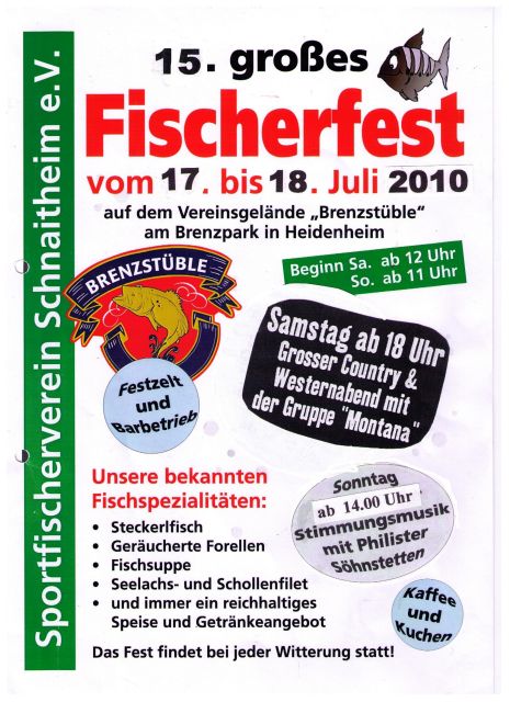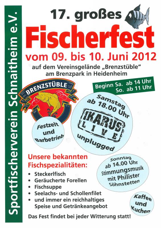 Der Sportfischerverein Schnaitheim e. V. veranstaltet am Samstag, 09. Juni und Sonntag, 10. Juni 2012 auf dem Vereinsgelände "Brenzstüble", Robert-Bosch-Straße 12, 89520 Heidenheim - am Brenzpark - das traditionelle "Fischerfest", das sich bereits durch seine große Beliebtheit einen Namen gemacht hat.